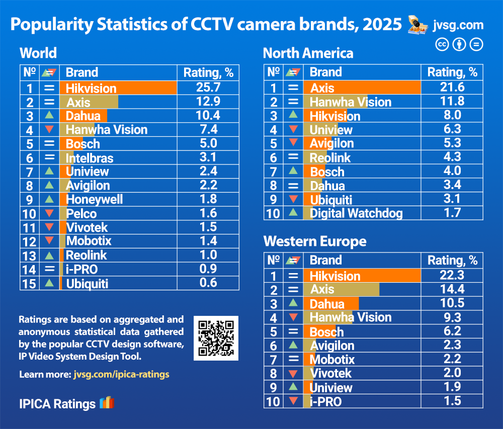 Ratings are based on aggregated and anonymous statistical data gathered by our video surveillance system design software, IP Video System Design Tool (developed by IPICA LLC). For world rating the number of data points is more than 250,000.